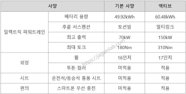 내장, 인포테인먼트, 안전 및 운전자 보조 사양은 동일하지만 일렉트릭 파워트레인, 외장, 시트, 편의 사양에서 차이가 있습니다.