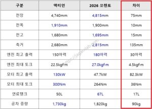 액티언 하이브리드 vs 2026 쏘렌토 하이브리드 기본 사양(깡통) 가격, 파워트레인, 제원, 연비, 기본 품목 비교