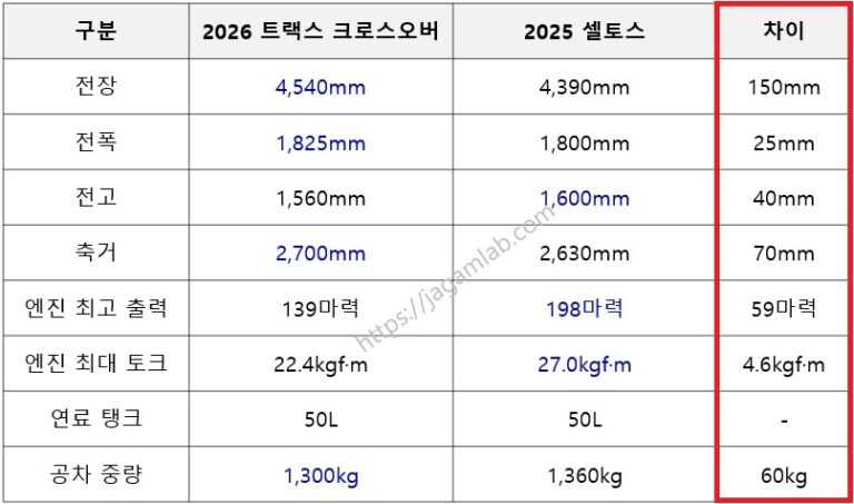 2026 트랙스 크로스오버 1.2 가솔린 터보 vs 2025 셀토스 1.6 가솔린 터보 기본 사양(깡통) 가격, 파워트레인, 제원, 연비, 기본 품목 비교