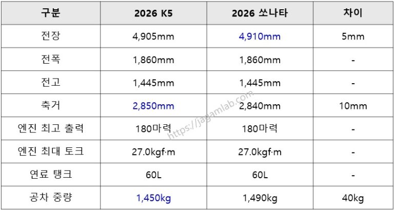 2026 K5 vs 2026 쏘나타 디 엣지 가솔린 1.6 터보 기본 사양 가격, 파워트레인, 제원, 연비, 기본 품목 비교
